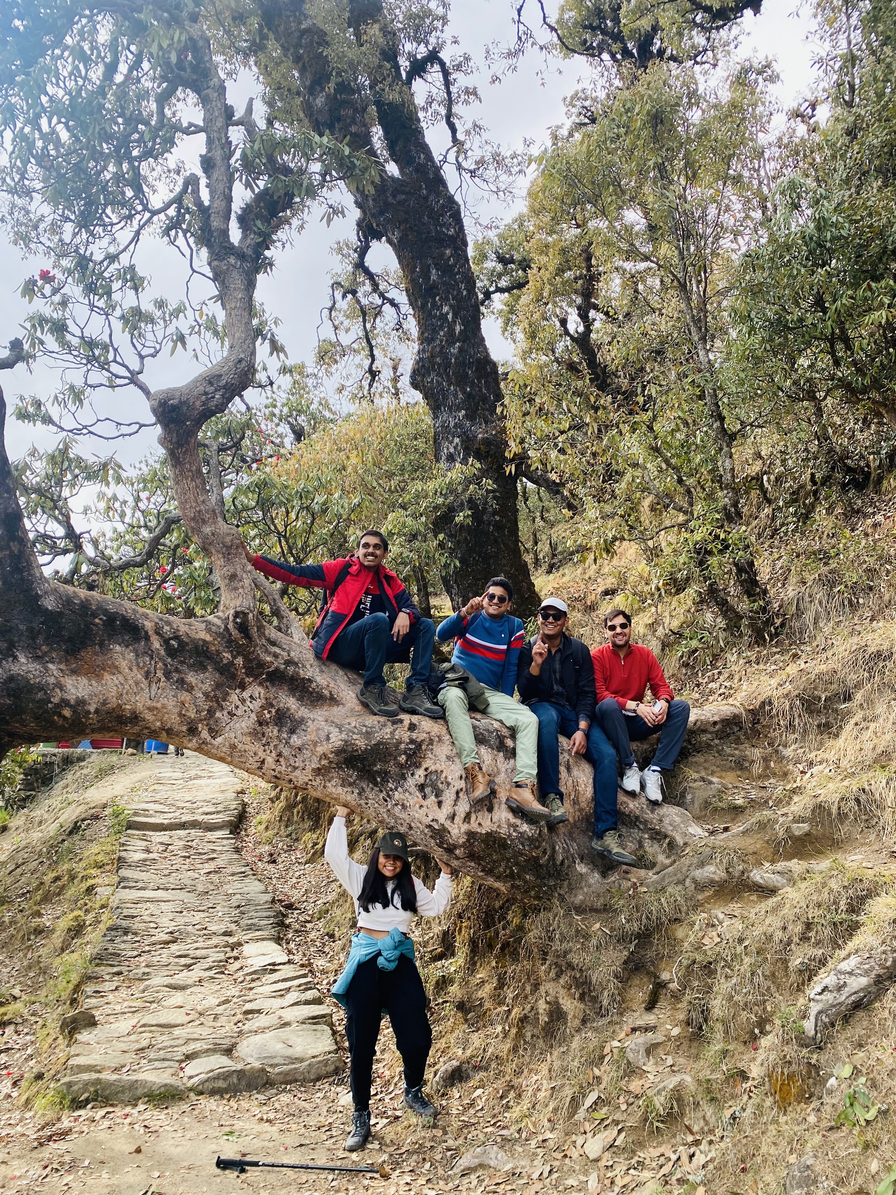 The 4-5 km trail was forested, with sun rays peeking between pines. On the way, we clicked silly photos – sitting on trees, lying on stones, posing like explorers.
